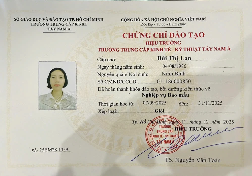 Cô Bùi Thị Lan là bảo mẫu tận tâm, có nhiều năm kinh nghiệm trong việc chăm sóc và đồng hành cùng các bé từ 0 -6 tháng tuổi. Với tính cách nhẹ nhàng, chu đáo và kỹ năng chuyên nghiệp, cô Lan luôn mang đến cho gia đình sự an tâm, tin tưởng và hài lòng trong từng buổi chăm bé.